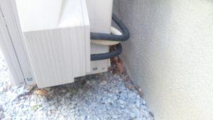 こちらも施工中の写真は撮れなかったのですが、施工後はこんな感じです。外にある本体に繋いだ銅線を既存の配管を使用して床下へ引込み、WI-FIアダプター本体は床下へ取付けました。最初、室外機横に新たに穴を開けてトイレにアダプターを設置しても良いですか?と聞かれたのですが、トイレにエコキュートのアダプターはおかしいのでお断りしました。。。結果としては、既存の配管を通して無事に床下へ引き込むことが出来ました。
