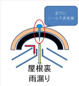 瓦と棟換気口を固定している釘のところでシール不良があり
