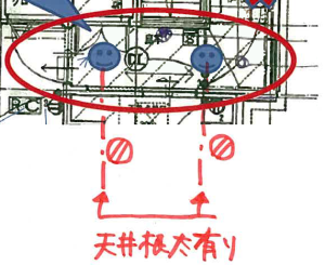 我が家の場合、青いニコちゃんマーク(笑)のところにダウンライトを設置したかったのですが、根太くんの通り道にばっちりはまってしまい、横にずらせば取付可能となってしまいました。
