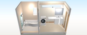 あと、うちは浴室・洗面台・洗濯機の順で並んでるのですが、この案のように浴室・洗濯機・洗面台のほうが、一般家庭だと使いやすいでしょうね。家族に女性がいると、脱衣コーナーみたいなのがあったほうがいいと思うので、洗濯機横をカーテンとかで仕切ったら、お風呂に人がいても洗面台も使えていいかなと。